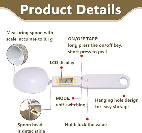Cuillère Doseuse à Graduation 0,1g jusqu'à 500g, Balance à Cuillère Numérique, Cuillere Mesure Gramme, 4 Unités de Mesure, Idéale pour Cuisine, Poudres et Aliments, Design Ergonomique