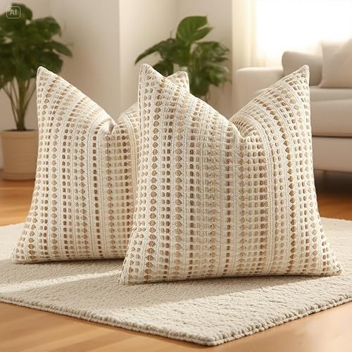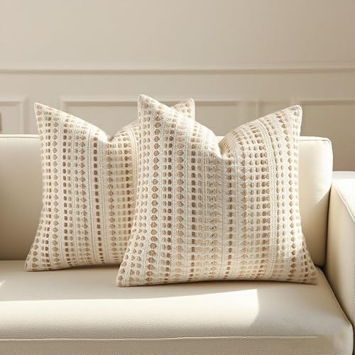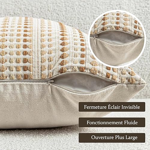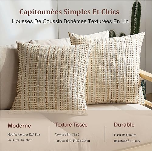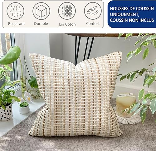 Boho Housse Coussin 45x45 cm Coton Lin Rayures Housse de Coussin Canape Beige Marron Rayé Tissées Texturées Touffetées Ferme Taie d'oreiller Decoratif pour Maison Salon Chambre Extérieur Lot de 2