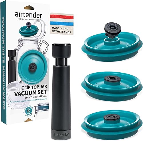 Airtender - Couvercle sous vide pour bocaux Mason - Avec pompe à vide - Set de 3 couvercles - Kit de démarrage - Compitable avec, entre autres, les bocaux Kilner, Bormioli et Ikea