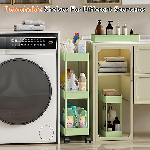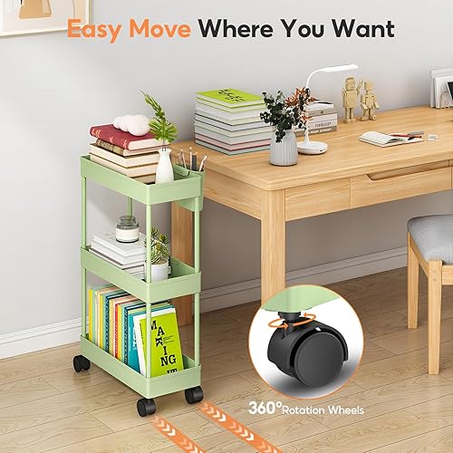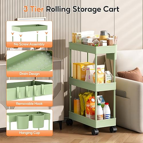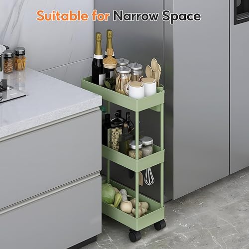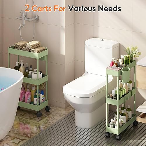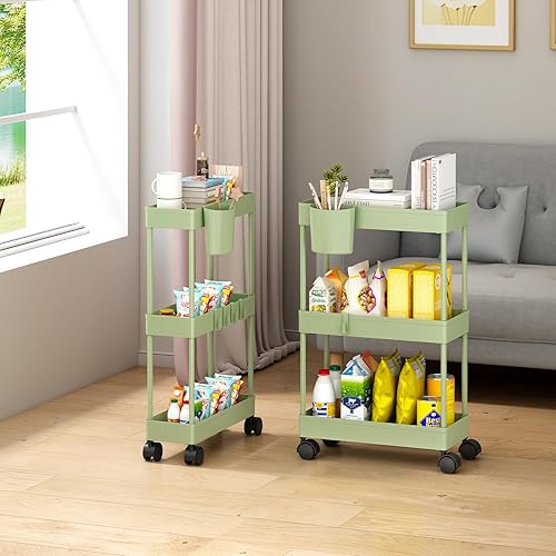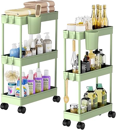Shrivee Lot de 2 Chariot de Rangement à 3 Niveaux à roulettes avec avec Crochets et suspendues Amovibles pour Salon/Salle de Bain/Salle de Bain/Buanderie/Cuisine/Bureau (Vert)