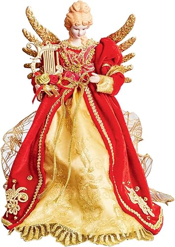 Décoration avec ange pour sapin de Noël – ange avec harpe rouge et or – ailes métal doré