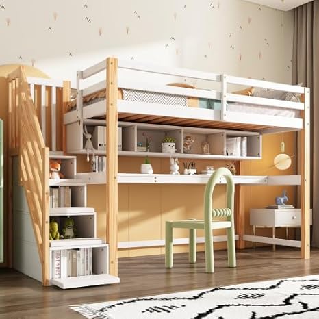 Seyakany Lit Mezzanine Enfant avec escalier de Rangement, lit Enfant 90x200cm avec Grand Bureau et étagères, peintures écologiques, Bois Massif + MDF, Blanc + Chêne