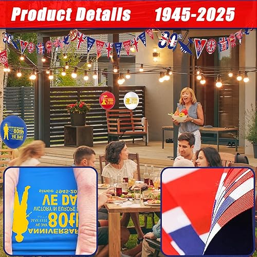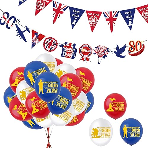 Lot de 20 bannières de ballons VE 80e anniversaire 2025, 18 pièces de 30,5 cm rouge, blanc, bleu, 2 bannières de 80 ans pour la victoire en Europe VE Day 80e anniversaire décorations commémorations
