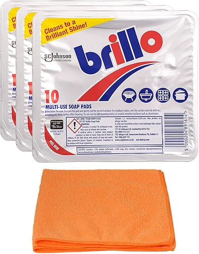 Brillo Lot de 3 x 10 tampons de savon multi-usage avec chiffon de nettoyage en microfibre ultra absorbant
