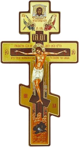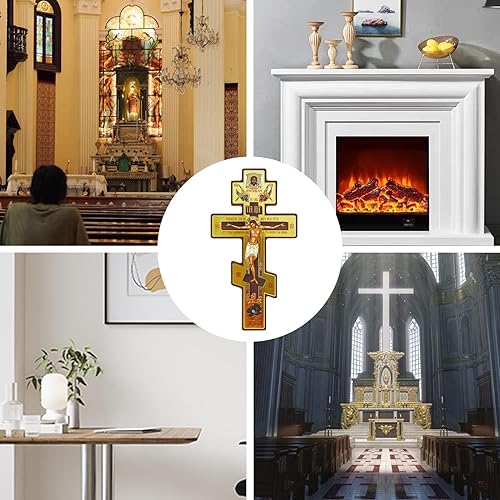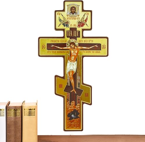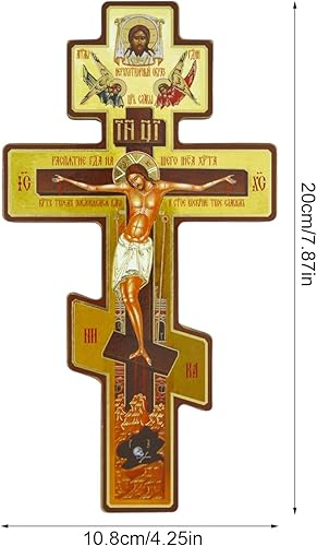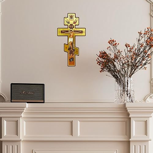 Statue de croix murale orthodoxe russe de 20,3 cm, crucifix byzantin en bois à trois barres, motif double face pour décoration de coin de prière intérieure à suspendre pour chambre à coucher, salon