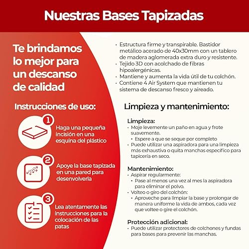 Somnia Descanso - Base tapissée 3D renforcée, Grande stabilité avec 5 Barres transversales et 6 Pieds métalliques filetés de 27 cm, 90 x 190, Beige