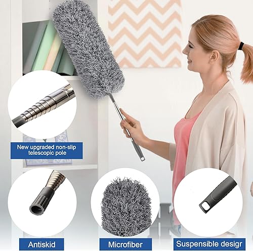 Plumeau Poussière, FUUNSOO Plumeaux avec Poignée en Acier Inoxydable Rallonge Télescopique de 76 à 245 cm, Plumeaux RéUtilisables Et Flexibles, Lavables pour Nettoyer Le Ventilateur De Plafond