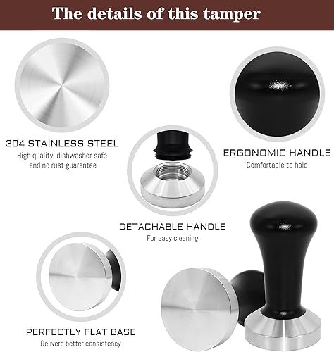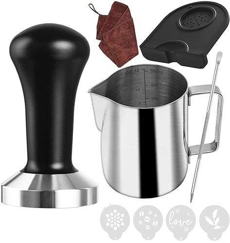 51mm Tamper Presse-moutures Presse à Café en Acier Inoxydable 51 Presser Machine à Expresso Porte-Filtre Barista Accessoire avec Tapis de Cafe, Pot à lait, Serviette Barista et Stylo Barista