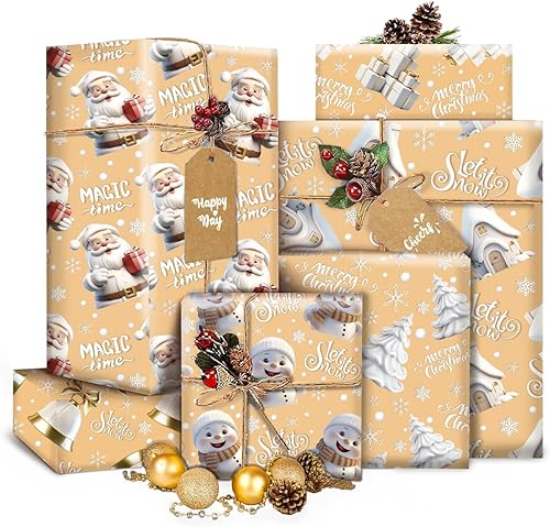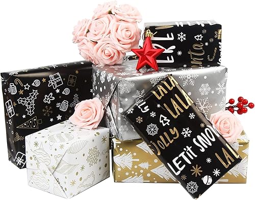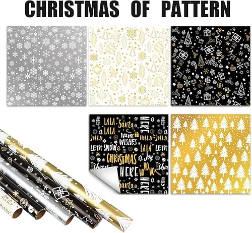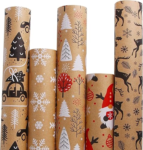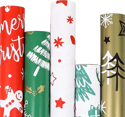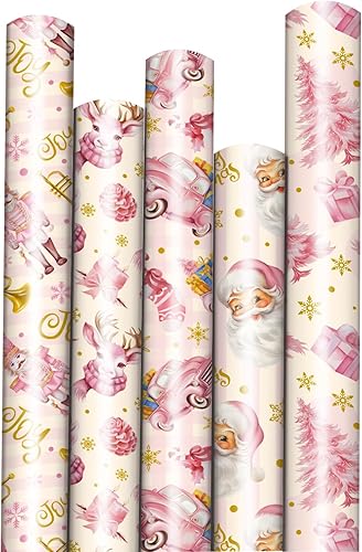 SULOLI 5 Rouleaux Rose Papier Cadeau Noël, Papier d'Emballage de Noël en 5 Motifs Différents, Set de Papier Cadeau de Noël (43cm*3m)