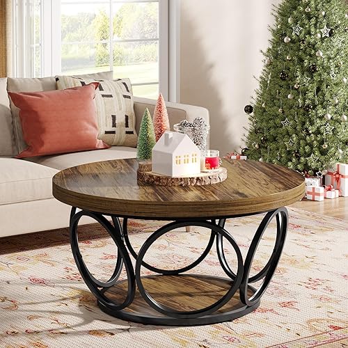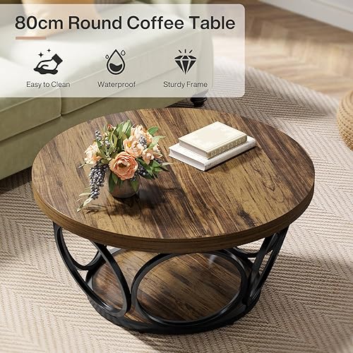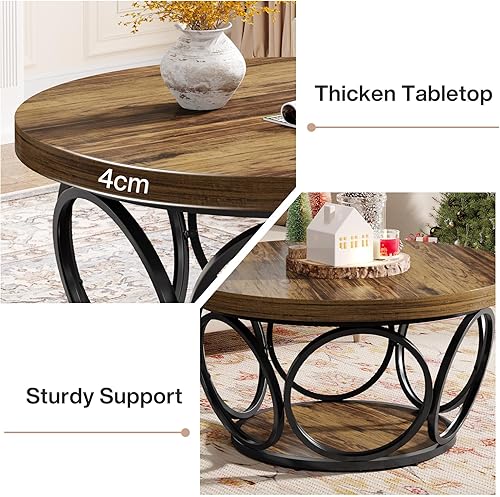 Tribesigns Table Basse Ronde 2 Niveaux, Table de Salon Bois 80 cm, Structure en métal, T-Able Ronde Bois, Plateau Épaissi, Facile à Monter Industriel (Grain du Bois)