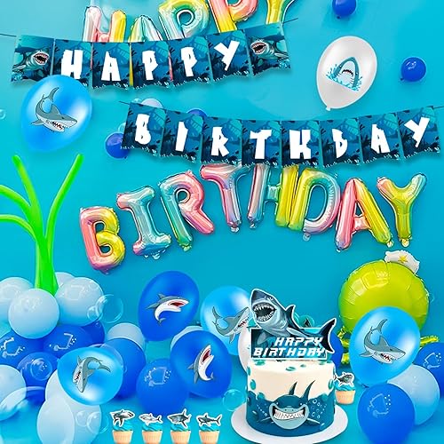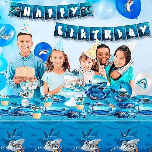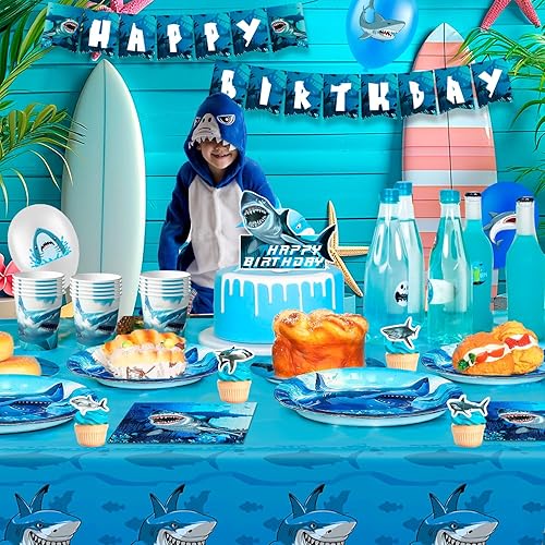 Vaisselle de Requin,111pcs Vaisselle d'Anniversaire Requin & Requin Anniversaire Décorations Set - Assiettes de Fête Requin Nappes & Ballons de Fête Requin Bannière etc Fournitures de Fête de Requin