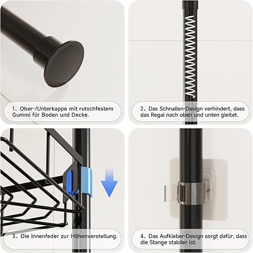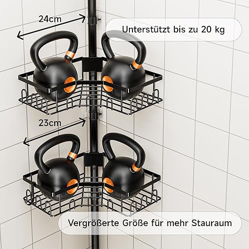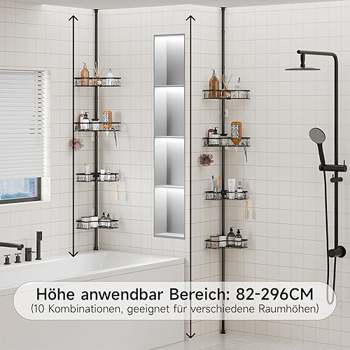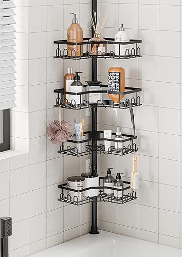 HouseUp Etagere Douche, Etagere Telescopique Douche sans Percage, Tablette d'angle Réglable en Hauteur avec 4 Paniers, Salle de Bain, Cuisine (Noir)