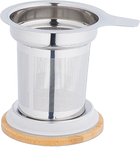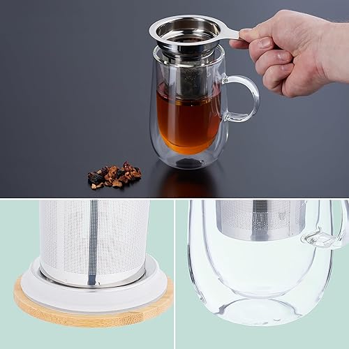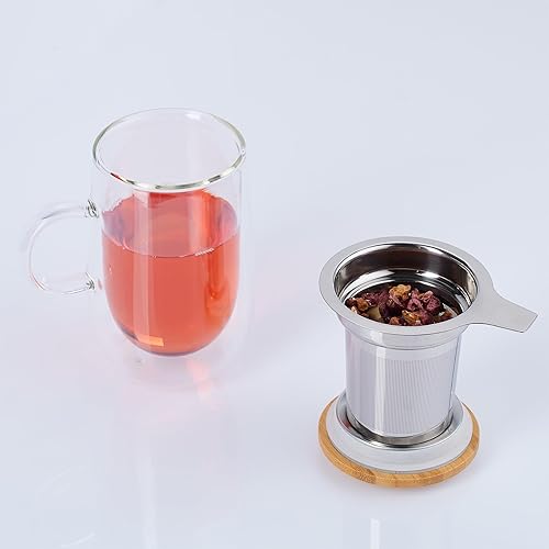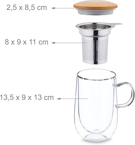 Relaxdays Tasse de thé, Verre, Double paroi, Couvercle en Bambou, infuseur en Acier INOX, capacité : 430 ML, Transparent
