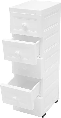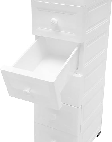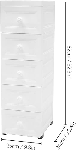 Tour de rangement blanche à 5 tiroirs avec poulie - Caisson à roulettes - 25 x 34 x 82 cm - Grande capacité - Tiroir transparent simple pour bureau scolaire et maison