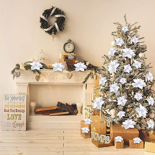 Boao Lot de 24 Fleurs de Poinsettia artificielles à Paillettes pour Mariage, Sapin de Noël, Nouvel an (Or Rose)