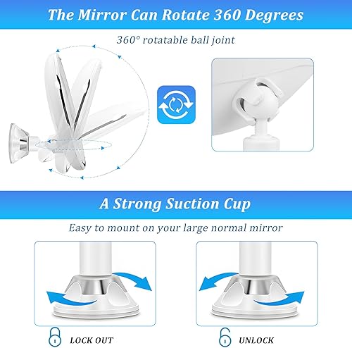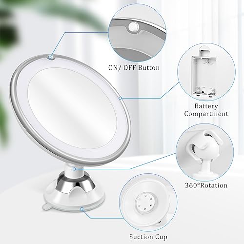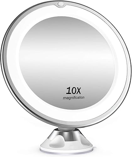 Miroir cosmétique grossissant x 10, éclairage LED, pivotant à 360°, miroir de rasage avec ventouse, miroir grossissant avec 3 piles AAA, pour la maison et les voyages, blanc