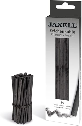 JAXELL 48239 Assortiment de 34 charbons à dessin de qualité artistique Dureté souple 34 demi-longueur env. 7,5 cm, 28 x diamètre 3-5 mm, 6 x diamètre 5-8 mm
