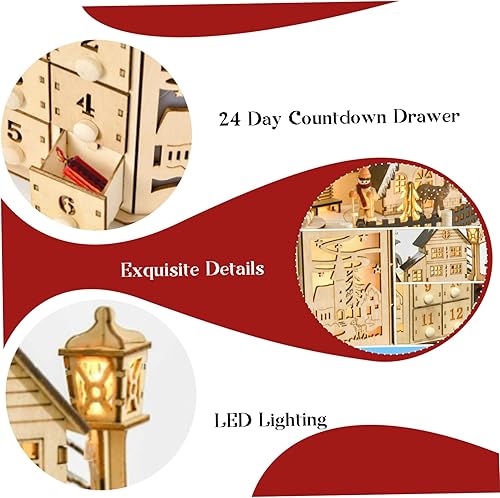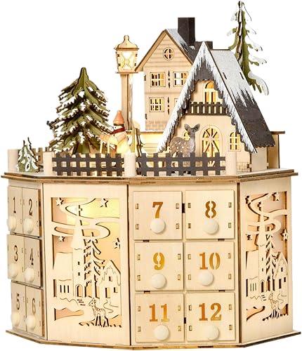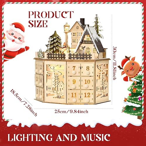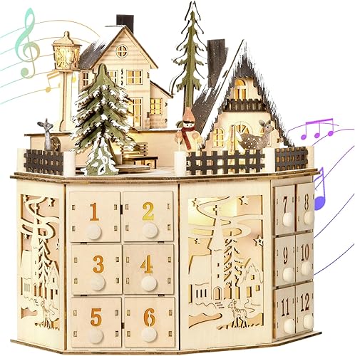 Cndiyald Calendrier de l'Avent en Bois, Calendrier de l'avant de Noël avec Musique, Calendrier de l'Avent avec 24 tiroirs, Calendrier de Noël éclairé