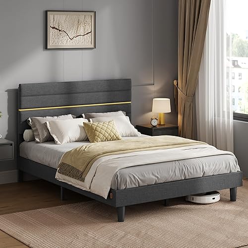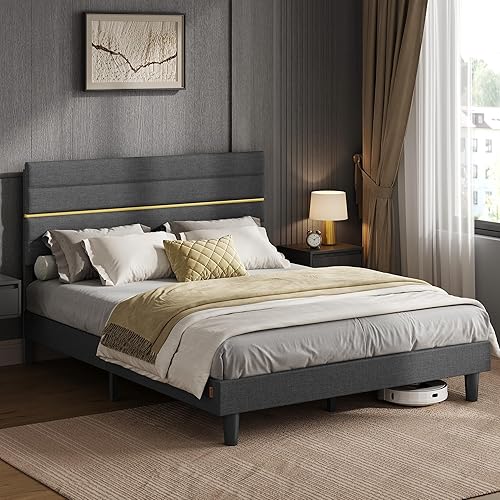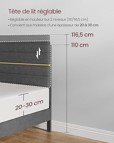 VASAGLE Lit Double, Cadre de Lit, Convient pour Un Matelas de 140 x 190 cm, Tête de Lit Rembourrée Ajustable, en Métal, Bois Massif, Moderne, Gris Ardoise RMB503G01