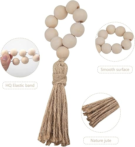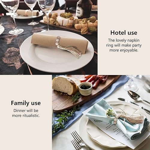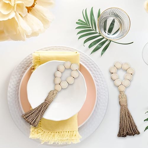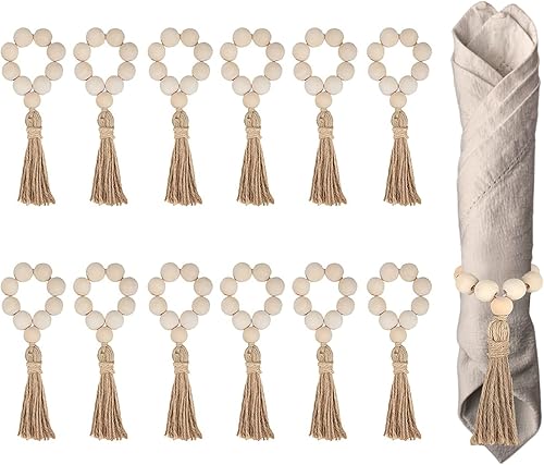 Lidzopas Lot de 12 ronds de serviette en perles de bois de style bohème faits à la main avec pompons pour Noël, ferme, mariage, décoration de table