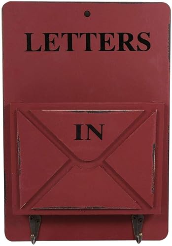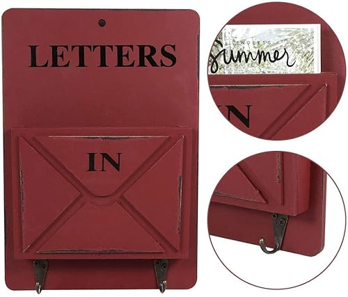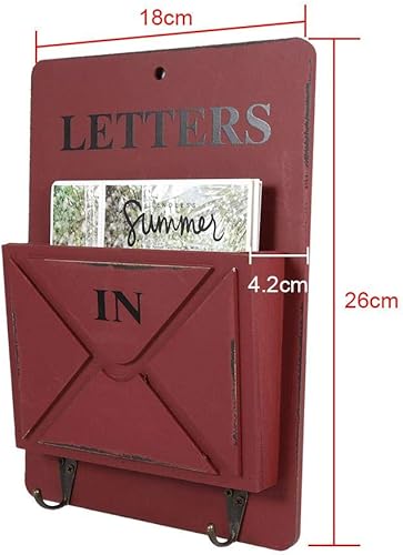 Asixx Porte-courrier, Boîte aux Lettres en Bois et Fer Porte-Lettres Mural avec 2 Crochets pour pour Stocker des Lettres, des Cartes Postales, des Journaux, Décoration de Maison, Salon et café(Rouge)