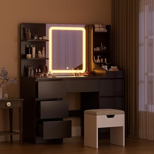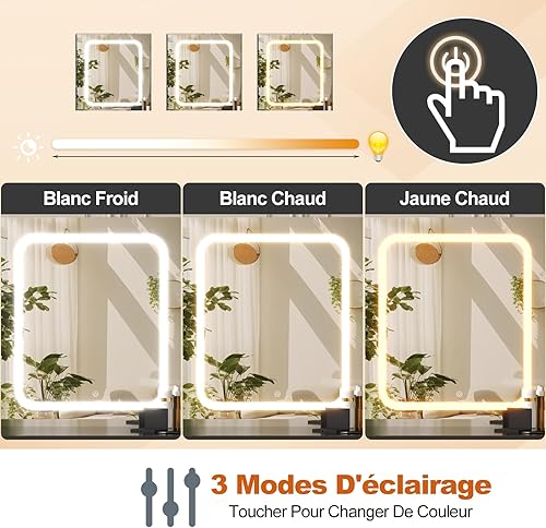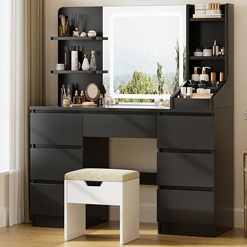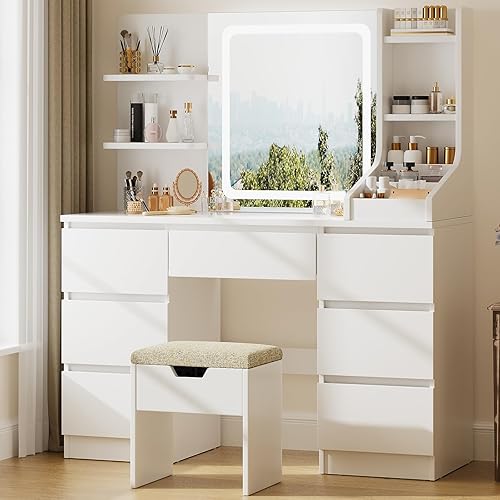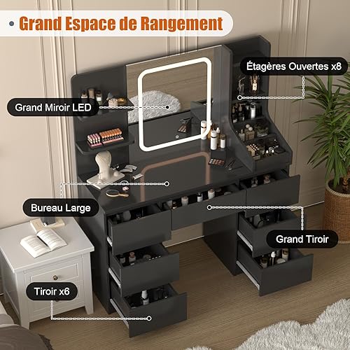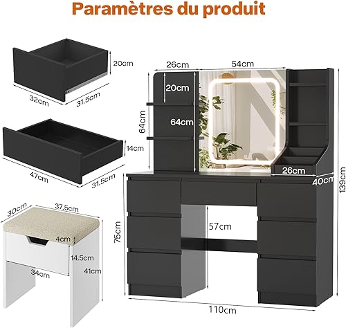TRIUMPHKEY Coiffeuse avec Miroir LED et Tabouret, 110x40x139cm Table de Maquillage avec 7 Tiroirs et 4 Étagères, 3 Compartiments, Grand Espace de Rangement, Coiffeuse Élégante Moderne (Blanc)