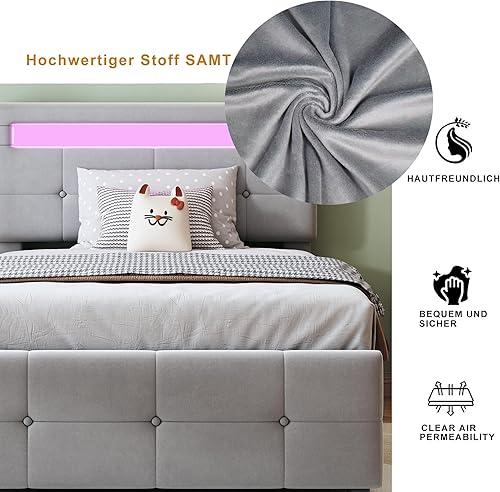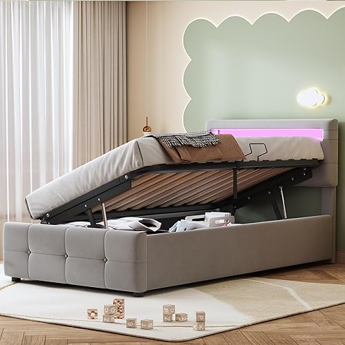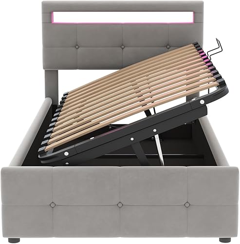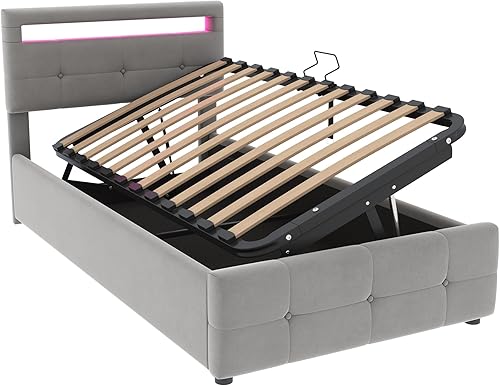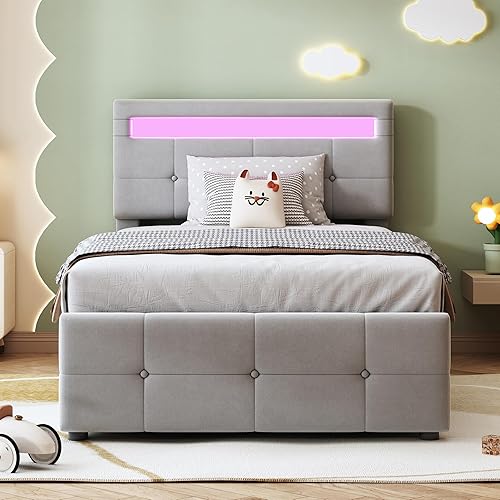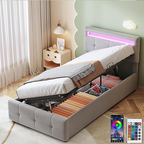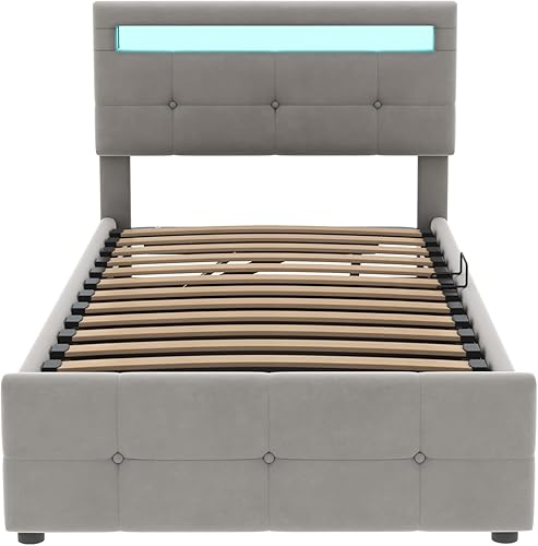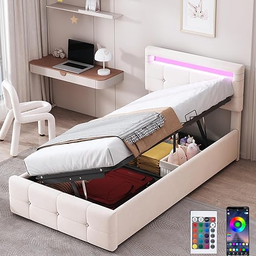 Zepneiy Lit avec LED, Lit Coffre 90x200 avec Espace de Rangement et tête de lit réglable, Lit 1 Place avec sommier à Lattes, Lit rembourré Cadre de lit Beige(sans Matelas)