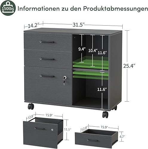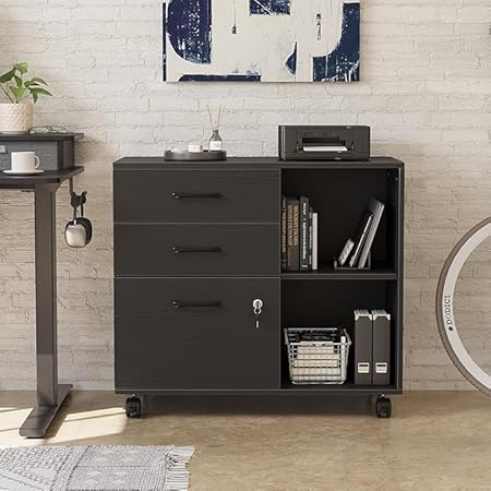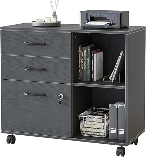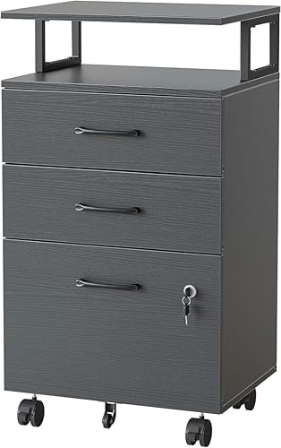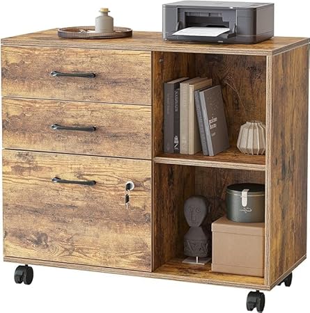 FEZIBO Armoire de classement mobile à 3 tiroirs, armoire latérale avec serrure, support d'imprimante avec compartiments de rangement ouverts pour le bureau à domicile, marron rustique