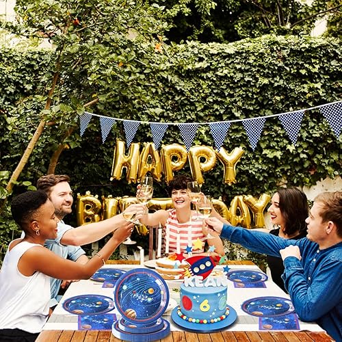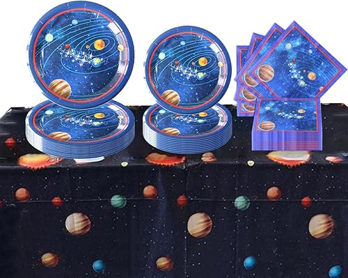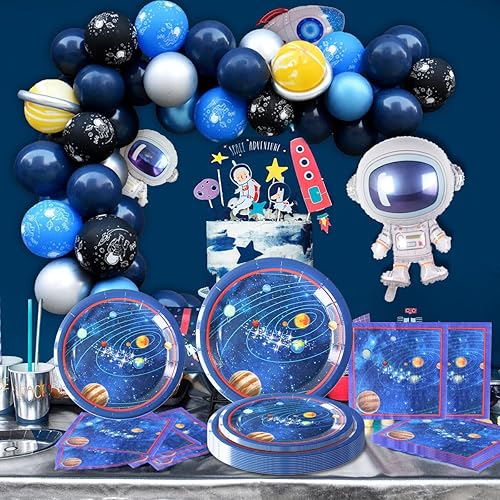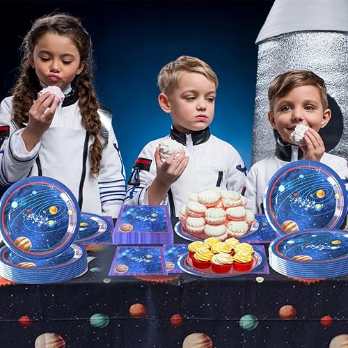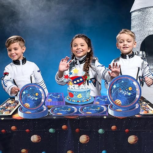 PIUMOJ Vaisselle de Fête Espace, Vaisselle Anniversaire Galaxie Planète, Kit Vaisselle Espace, Assiettes, Serviettes, Nappes, Décoration Anniversaire Thème Espace pour Enfant Garcons, 16 Invités