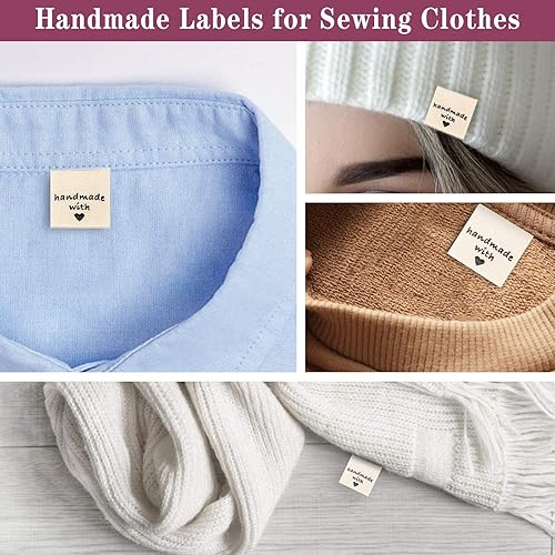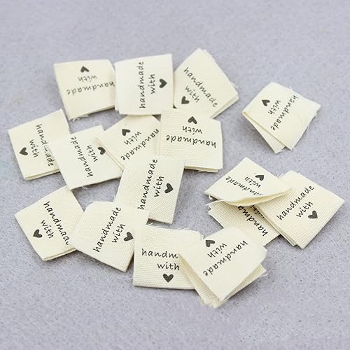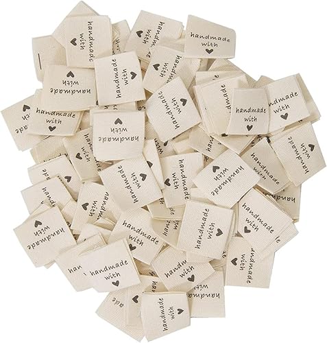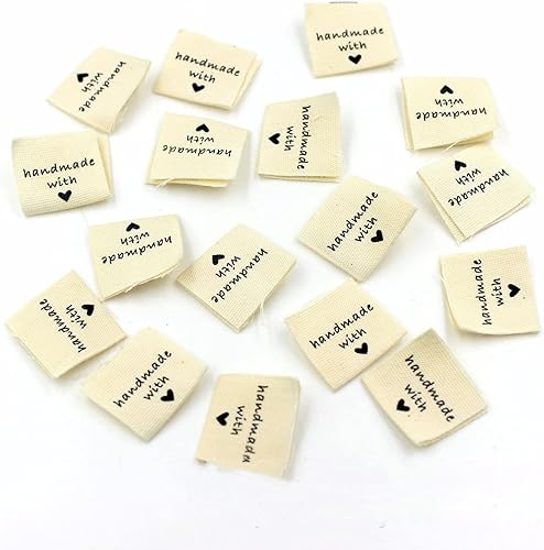 Étiquettes en Tissu,100 PCS Handmade Etiquette Fabriqué à la Main avec Amour Étiquettes Textiles à Coudre Étiquettes de Vêtements de Faites à la Main pour Bricolage Artisanat Décorations 2 x 4CM