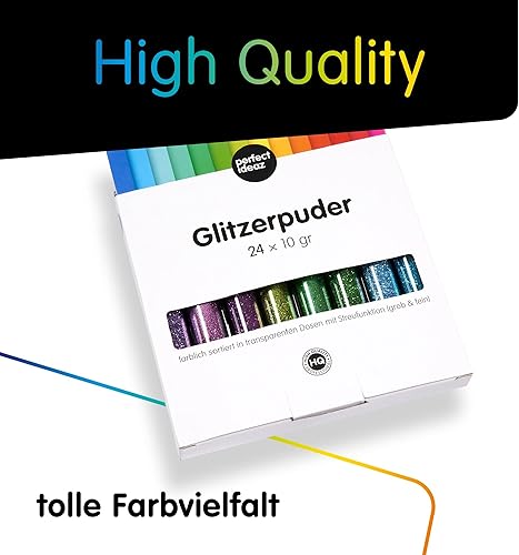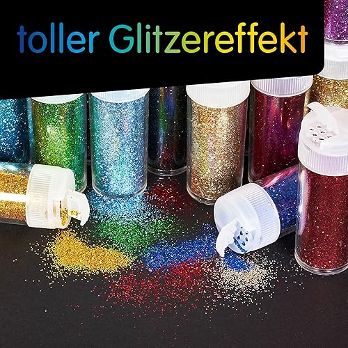 perfect ideaz set de poudre pailletée de couleur 24 x 10 g (240g), 24 couleurs, poussière pour bricolage avec couvercle saupoudreur, sable décoratif idéal pour bricoler les enfants, set décoration