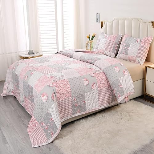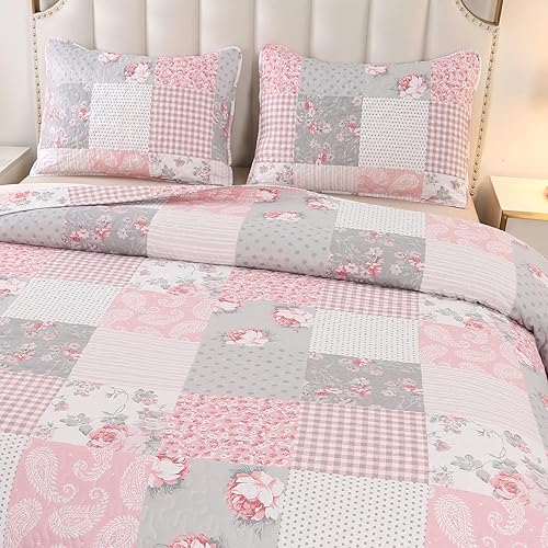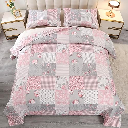 DECMAY Couvre Lit 2 Personnes 220x240 cm - Dessus de Lits et Couvre-Lits Patchwork en Microfibre Rose à Motif Floral - Couvre Canapé Léger et Confortable - Design Romantique