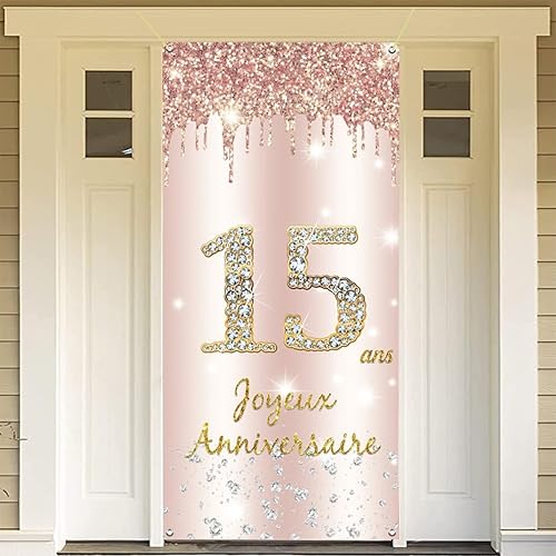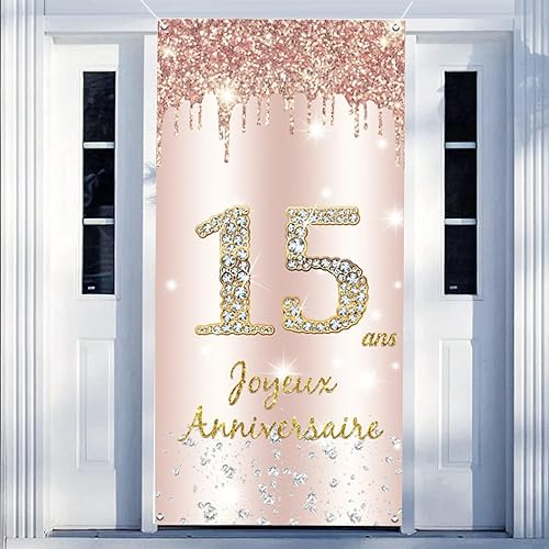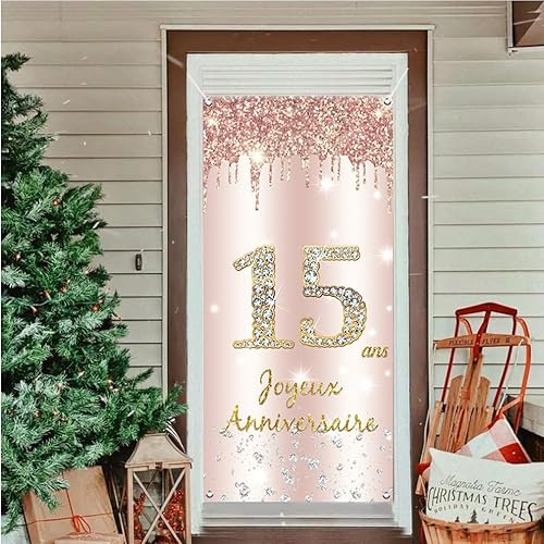Joyeux 15 ans Anniversaire Bannière en Or Rose, Décoration de Fête d'anniversaire 15 ans de Bannière de porte, Banderoles pour Fêtes Anniversaire de Fille, Signe de Bienvenue Fête d'anniversaire