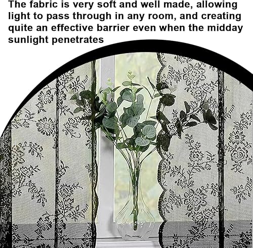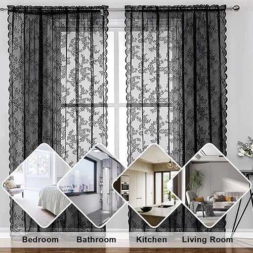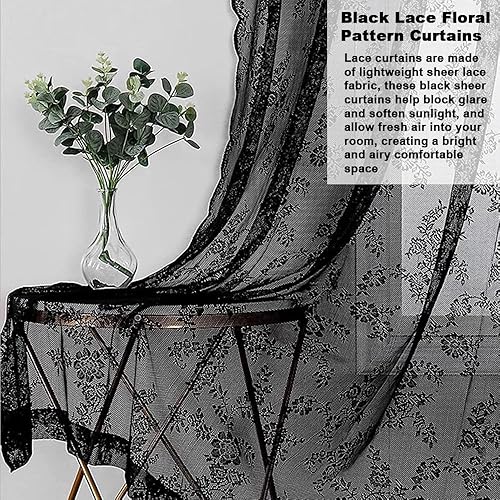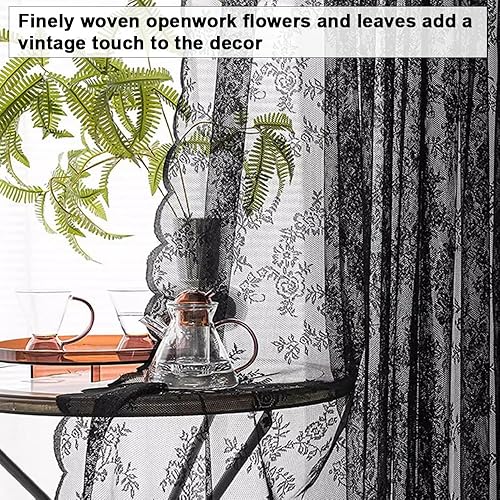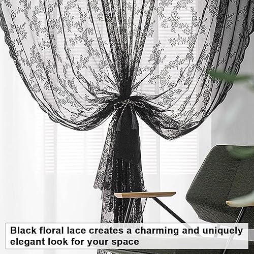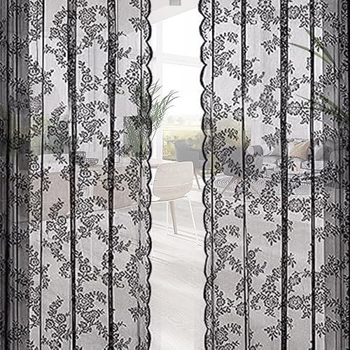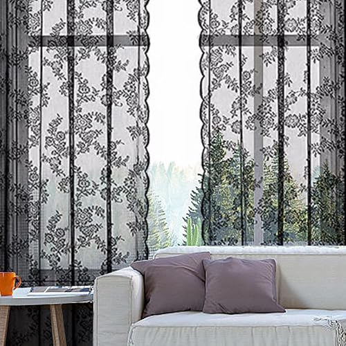 EUIEUT 2 PCS Rideaux en Dentelle Noir 145*230cm, Rideaux en Voile Noir Rideaux Transparents en Dentelle, Rideaux en Dentelle Gothique, Rideau Voilage Noir pour Porte, Fenêtre, Décoration, Photo (Noir)