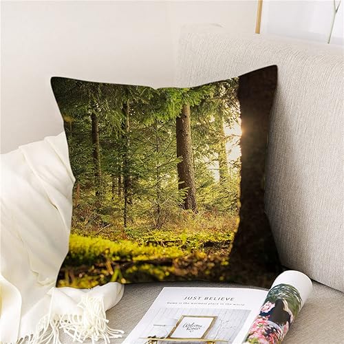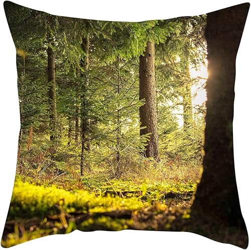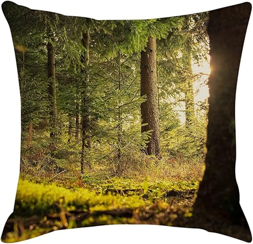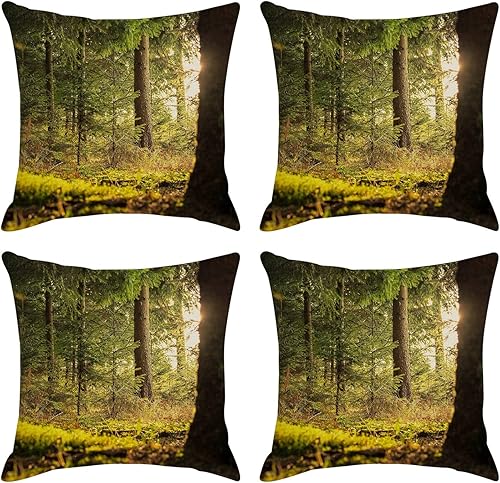 Daesar Lot 4 Housse Coussin 45x45, Taie d'oreiller Arbre de Lumière du Soleil Doux Decoration Maison Salon Chambre pour Canapé Marron Vert, Lin