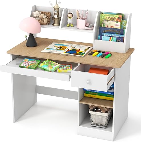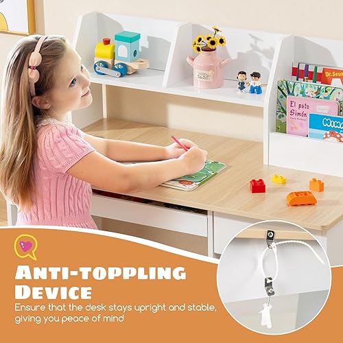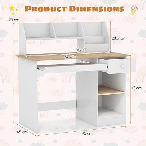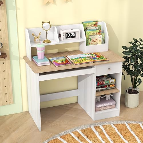 GOPLUS Table Enfant, Bureau Enfant en Bois avec Tiroir, 2 Étagères, Plateau à Clavier, 3 en 1 Bureau pour Fille Garcon avec Dispositif Anti-basculement, Naturel, 90X45X90CM