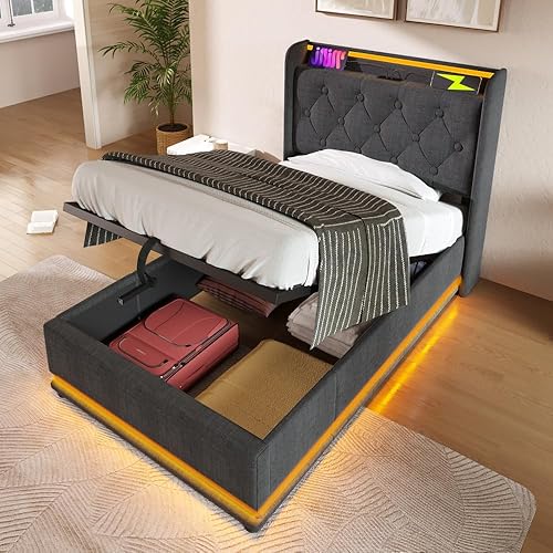 Lit coffre 160x200 avec fonction LED surround 360 et USB Type-C,lit 160x200 avec sommier à lattes,cadre de lit 2 personnes avec rangement,tissu en lin gris,tête de lit rembourrée(sans matelas)