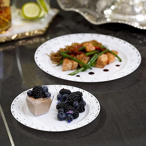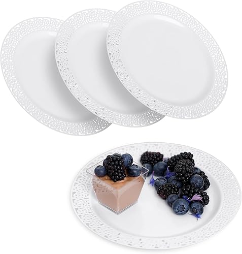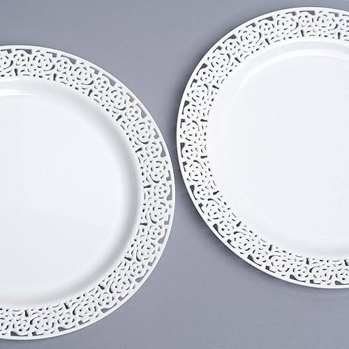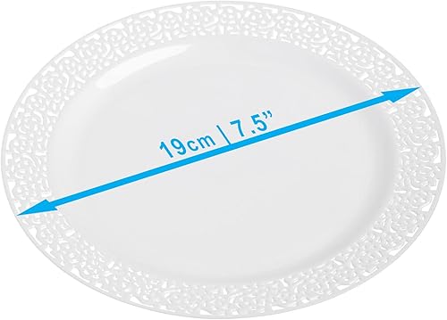 STACKABLES - Lot de 20 assiettes en plastique dur avec bordure ronde en dentelle blanche - Multifonctions et réutilisables - Assiettes de 19,1 cm
