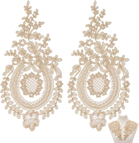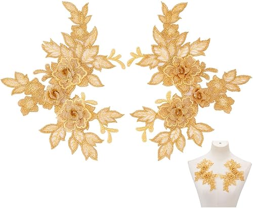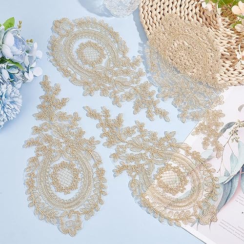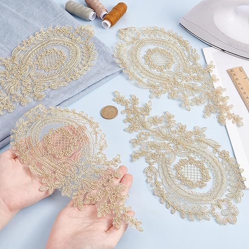 HOBBIESAY 4 pièce de Broderie de Fleurs en Dentelle Patch Floral Doré Clair avec Feuille à Coudre Sur Réparation Décoration pour Robe de Mariée Vêtements Bricolage