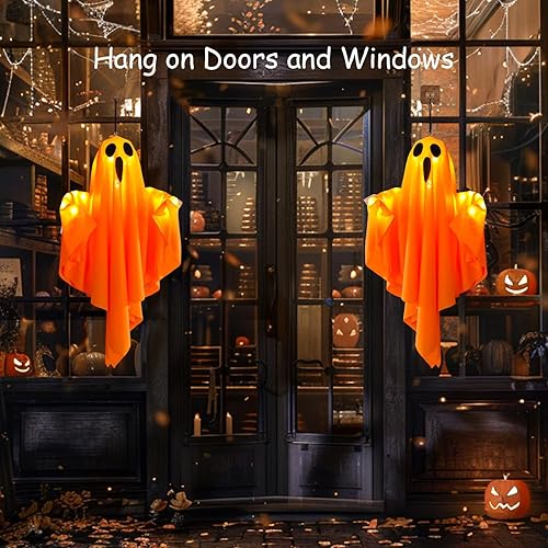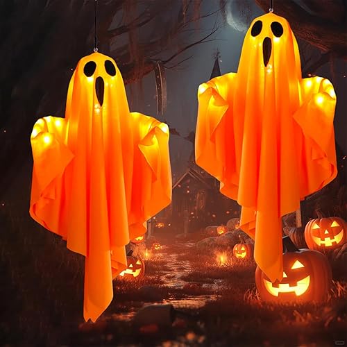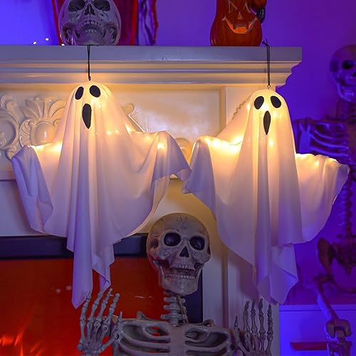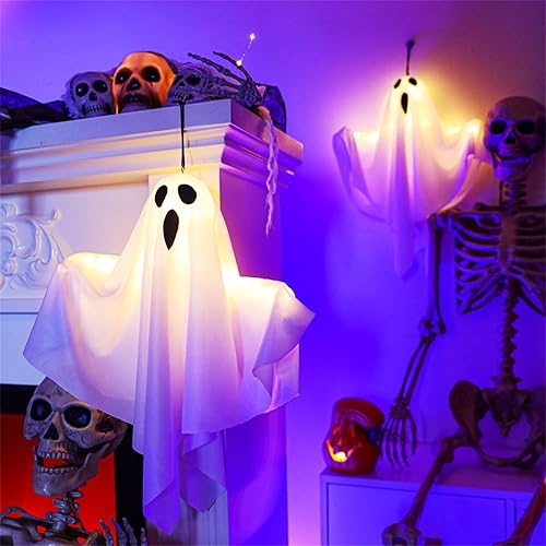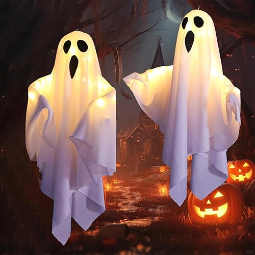 2 Pièces Fantôme à Suspendre Halloween avec Lumière - Décoration Extérieur Intérieur pour Jardin, Domicile (Blanc)