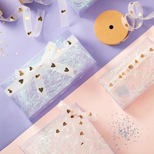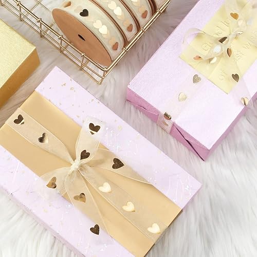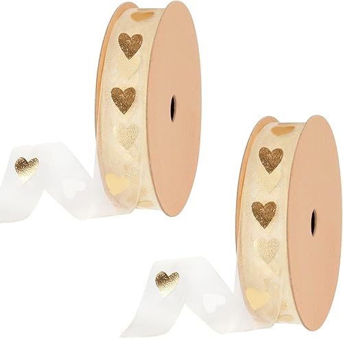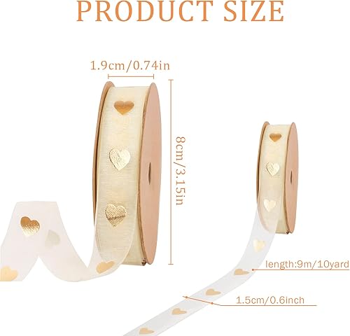 Ruban Satin Imprimé Coeur Doré Ruban Cadeau Décoratif Ruban de Fil à Neige pour Artisanat, Emballage Cadeau, Fleurs, Décoration de Mariage 2 Rouleaux (1,5cmx9m)