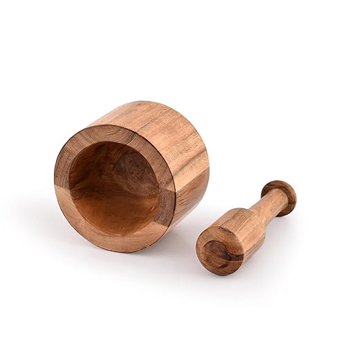 Samhita Mortier et pilon en bois d'acacia pour ail, poivre, herbes, ustensiles de cuisine, cadeau d'anniversaire, pendaison de crémaillère. Mortier - 10,2 x 7,6 cm - Pilon - 14 cm