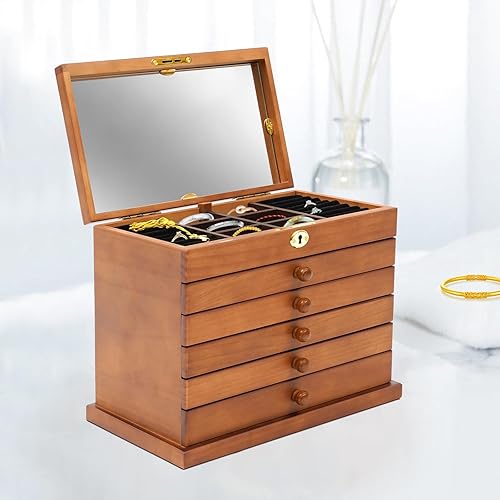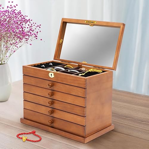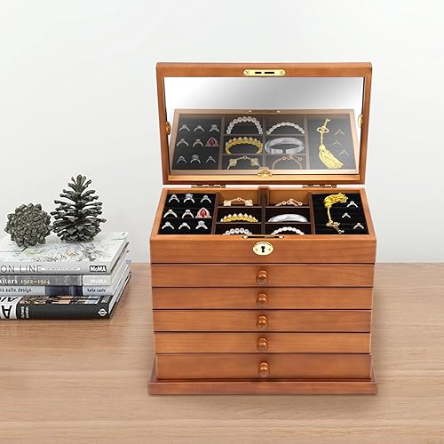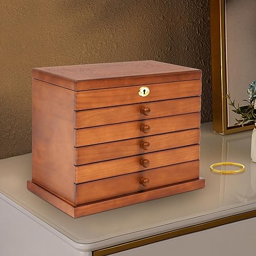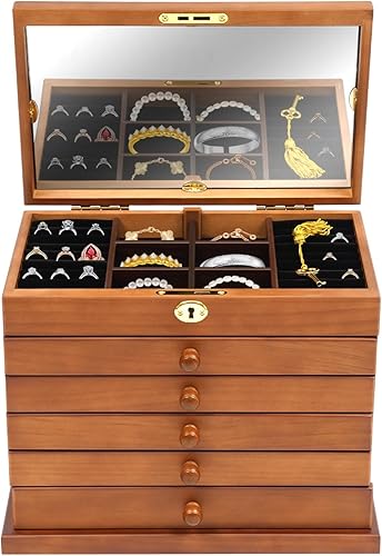 Boîte à bijoux rectangulaire en bois à 6 couches - Style vintage - Avec miroir et verrouillage de sécurité - Pour pendentifs, bracelets, broches, colliers, bagues, boucles d'oreilles