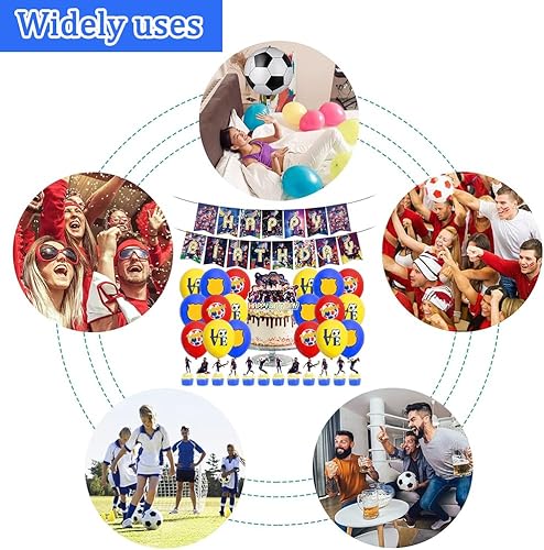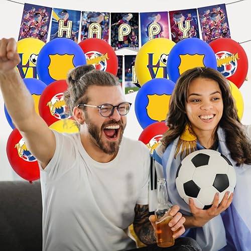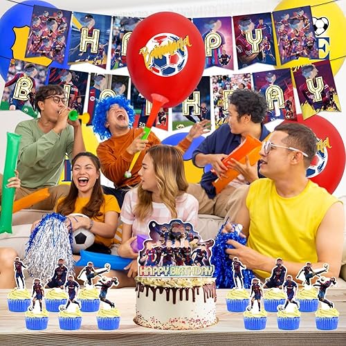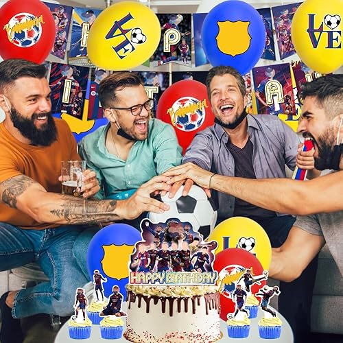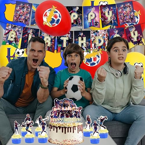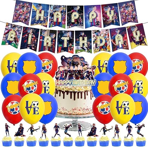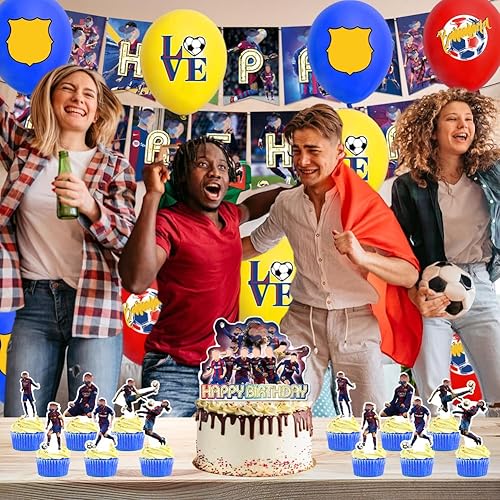 XNAUVOI 32 Pcs Barce-lona Ballon Anniversaire d'Enfant, Décoration de Fête d'Anniversaire Football - Bannière, Ballon, Décoration de Gâteau, Cupcake Top pour les Enfants Fans de Football