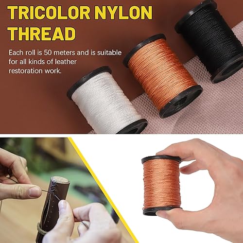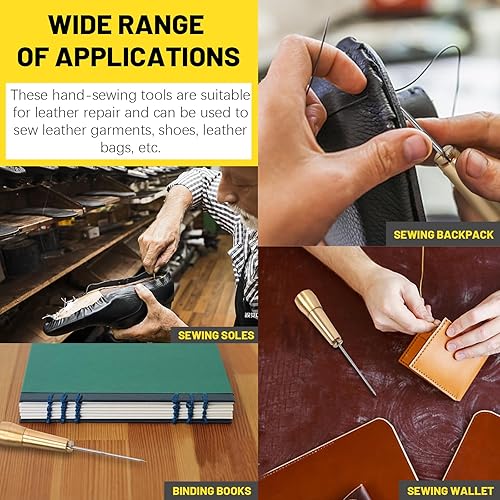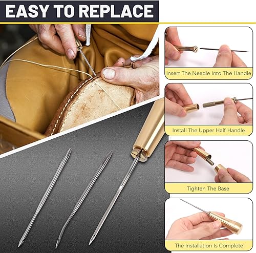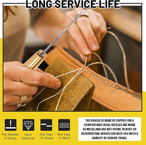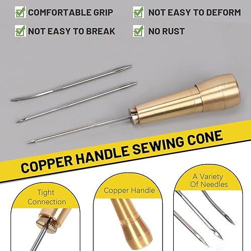Mardatt Kit de 19 alênes à coudre pour cuir comprenant une aiguille en cuir avec poignée en cuivre, des outils de travail de couture du cuir avec plusieurs types d'aiguilles, du fil ciré et un dé à