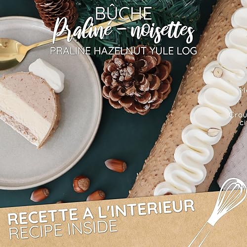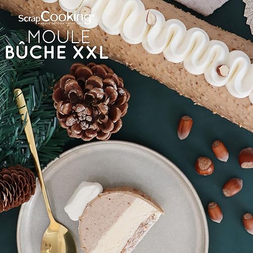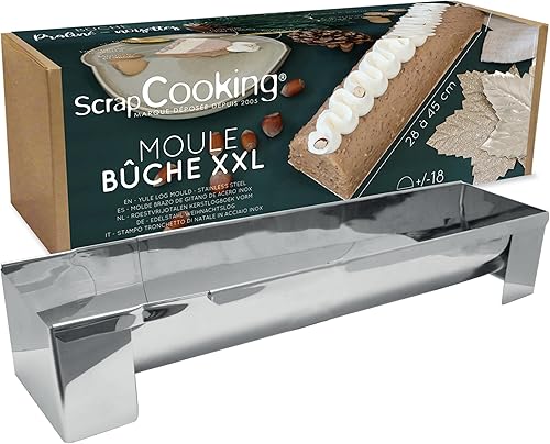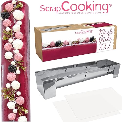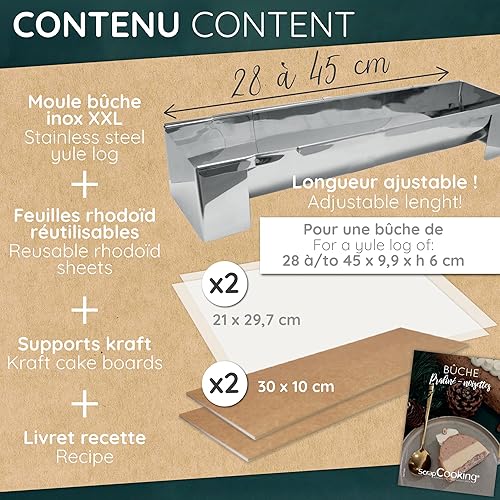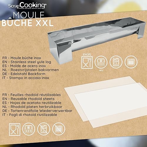 ScrapCooking - Moule Bûche Inox XXL - Taille Ajustable 28 à 45 cm - Dessert de Noël jusqu’à 18 Convives - Avec Feuilles Rhodoïd, Supports & Recette Bûche Praliné Noisettes - Pâtisserie - 1936