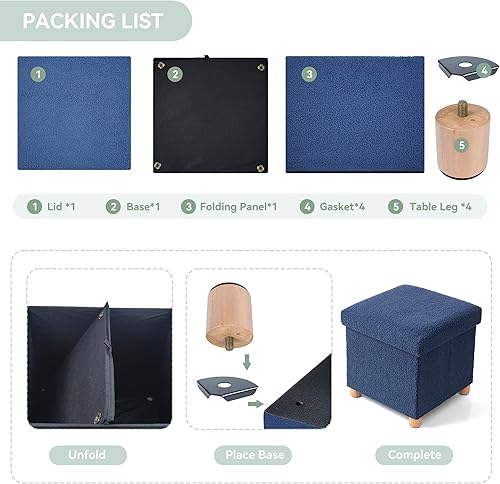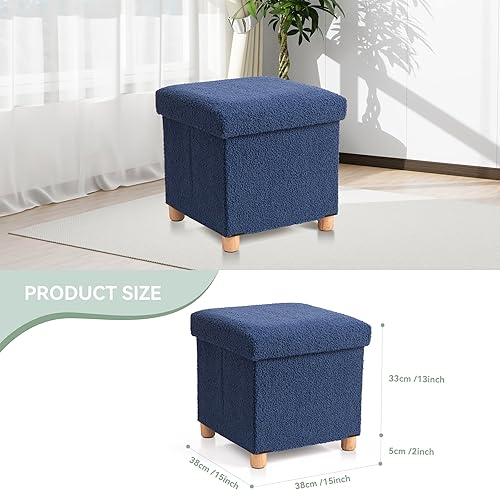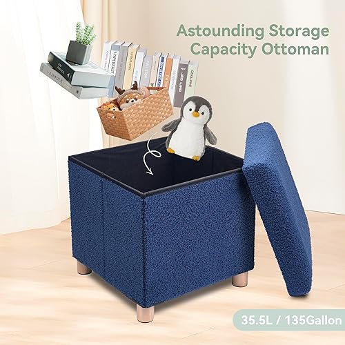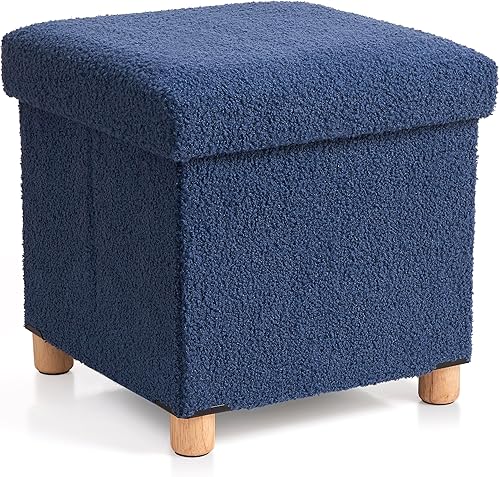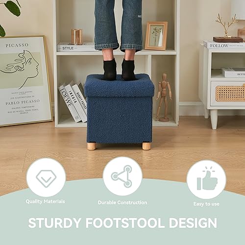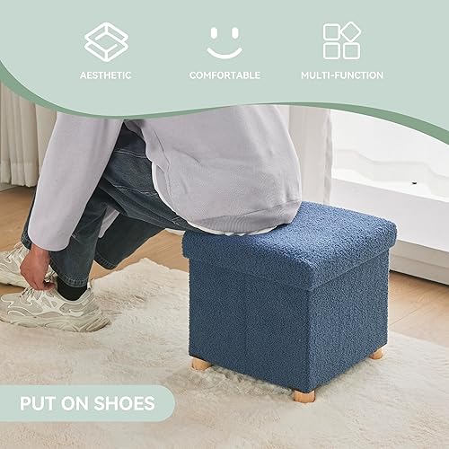 BRIAN & DANY Pouf de rangement en polaire Teddy avec pieds en bois - Repose-pieds avec espace de rangement - Pour salon, chambre à coucher - Bleu - 38 x 38 x 38 cm