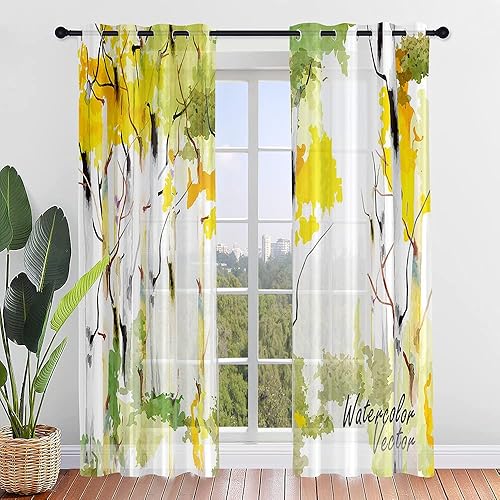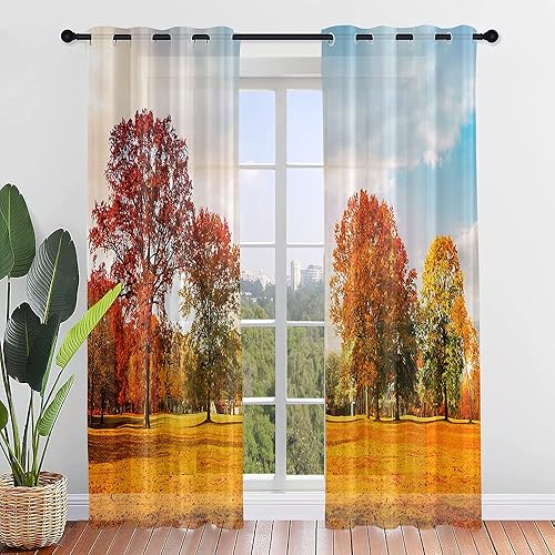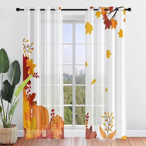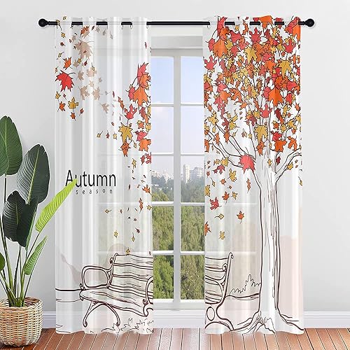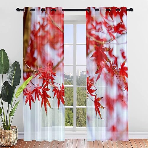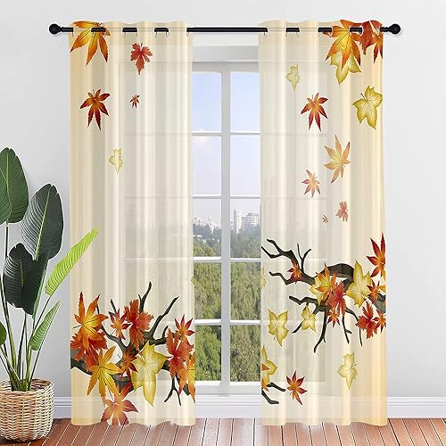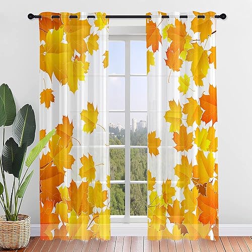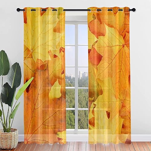 Surwin Imprimé Feuille D'érable Rideau Voilage, Lot de 2 Rideau à Oeillets, Voiles Intérieurs Translucides, Rideaux Salon Moderne pour Décorer Salon,Chambre,Cuisine (107x160cm,Orange)