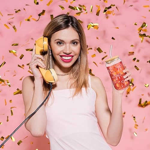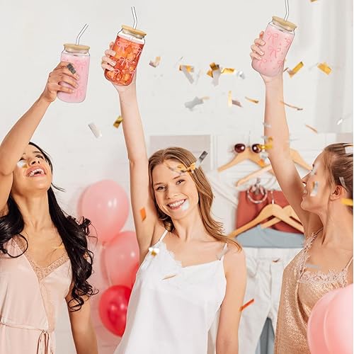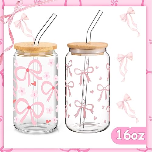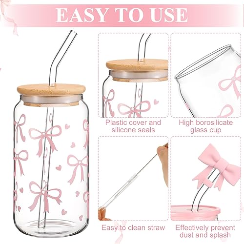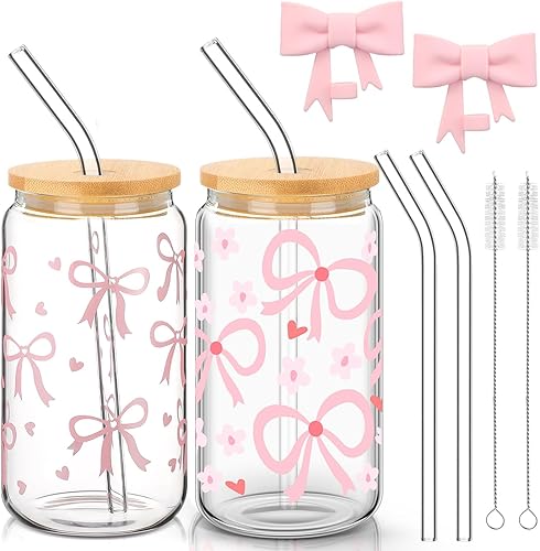 Auiremrti 2 pièces Bouteille en verre avec pression pour broyage, ensemble de verres de 16oz, verres Bow avec paille en verre paille en acier inoxydable et embouts réutilisables en silicone