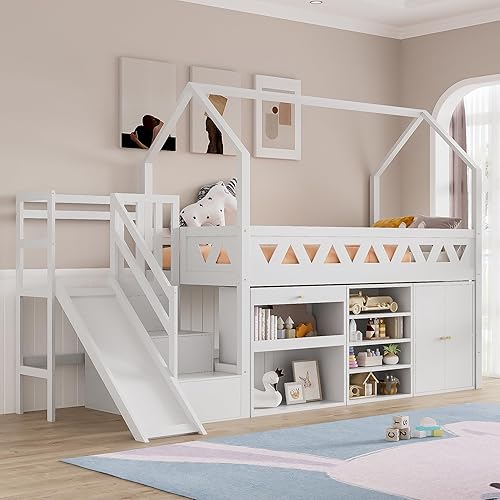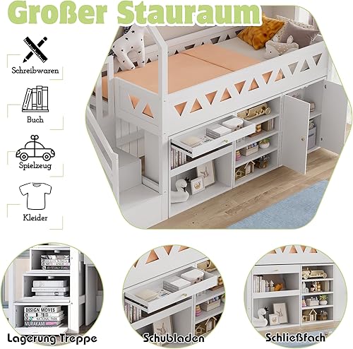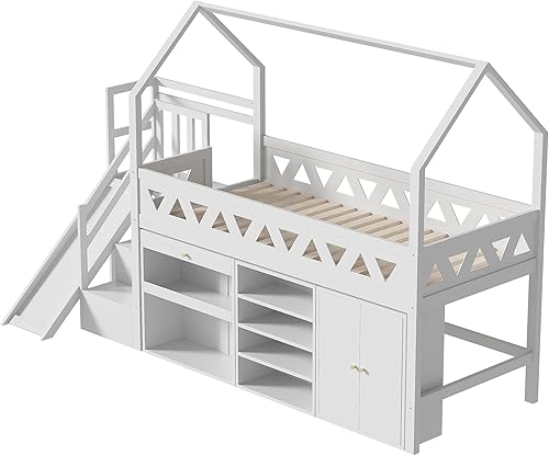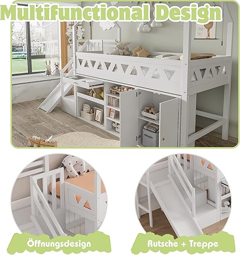 Lit cabane enfant 90x200 avec tiroirs et casier,lit superposé enfant 90x200 avec toboggan et escalier,lit mezzanine avec porte magnétique,lit simple multifonctionnel,sans matelas,bois massif,blanc